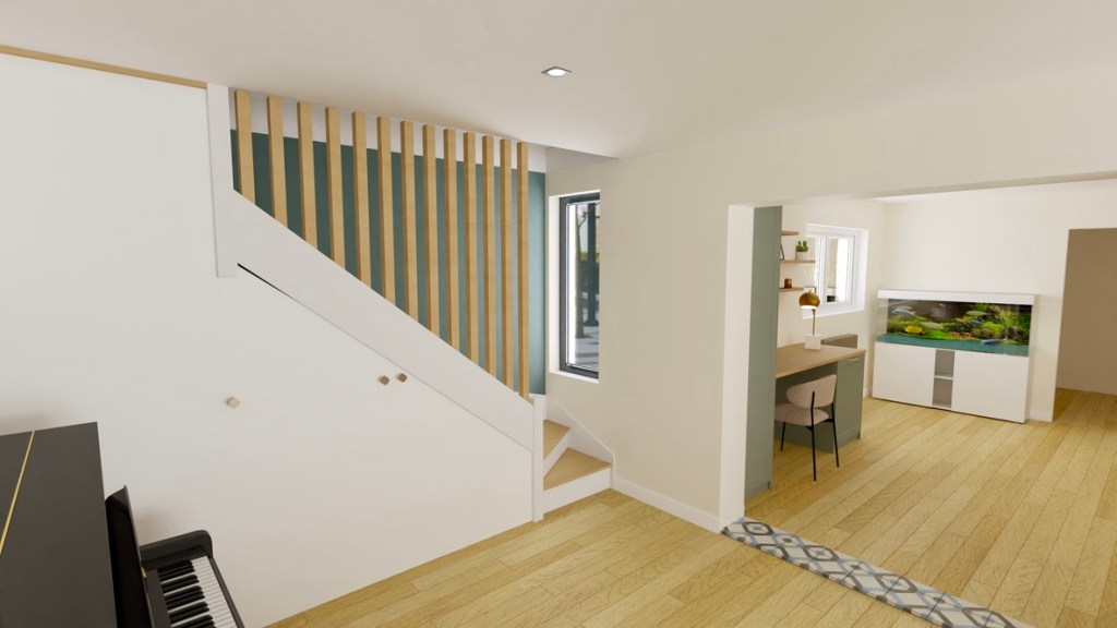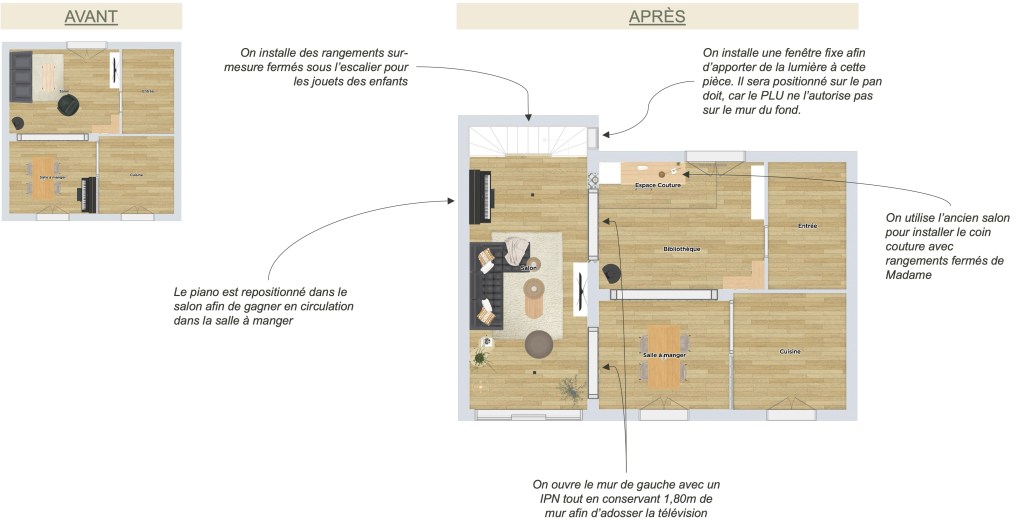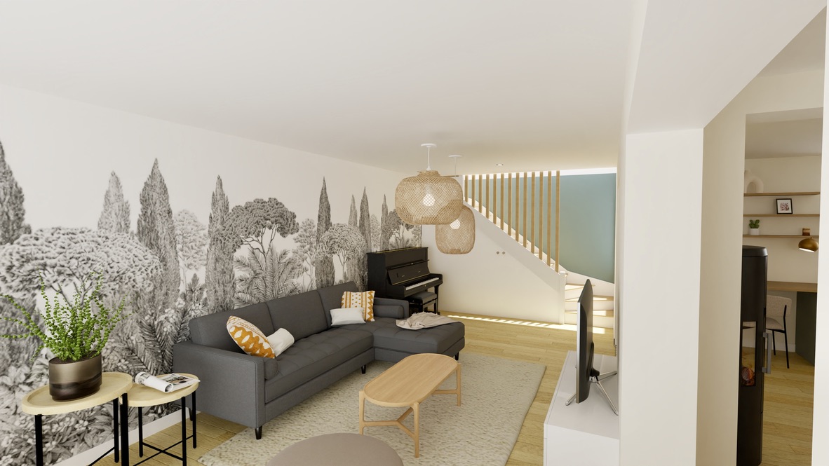 Avec l’arrivé de leur petit garçon et le lot de jouets qui va avec, Mr et Mme Bochev se sentaient à l’étroit dans leur pièce de vie actuelle. Après analyse du projet par un bureau d’étude, pour mesurer la faisabilité et étudier le PLU, j’ai accompagné cette famille dans l’agencement de ce nouveau rez-de-chaussée. Pour des raisons de coûts, j’ai retravaillé les espaces afin de ne modifier uniquement les pièces de vie (la cuisine fonctionnelle sera gardée dans son intégralité pour réduire les frais).